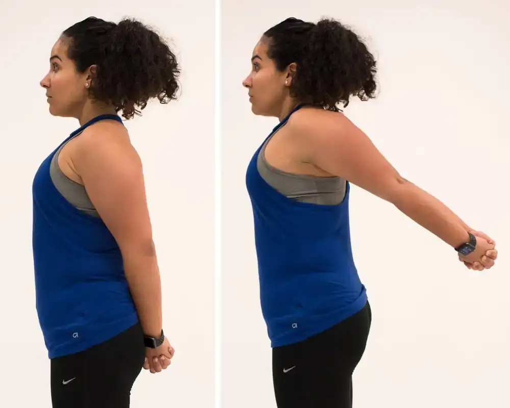 - From a standing position, extend your arm straight in front of you, and rotate your wrist so that it’s in a thumb-up position.